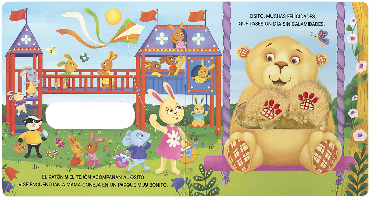 ¡Hoy es el cumpleaños del osito! ¿Quieres saber qué sorpresa le tienen preparada sus amigos? Abre el libro y averígualo. Con los bracitos de tela podrás hacer los gestos del osito. ¡Lo vais a pasar en grande! y recrear esta historia.
