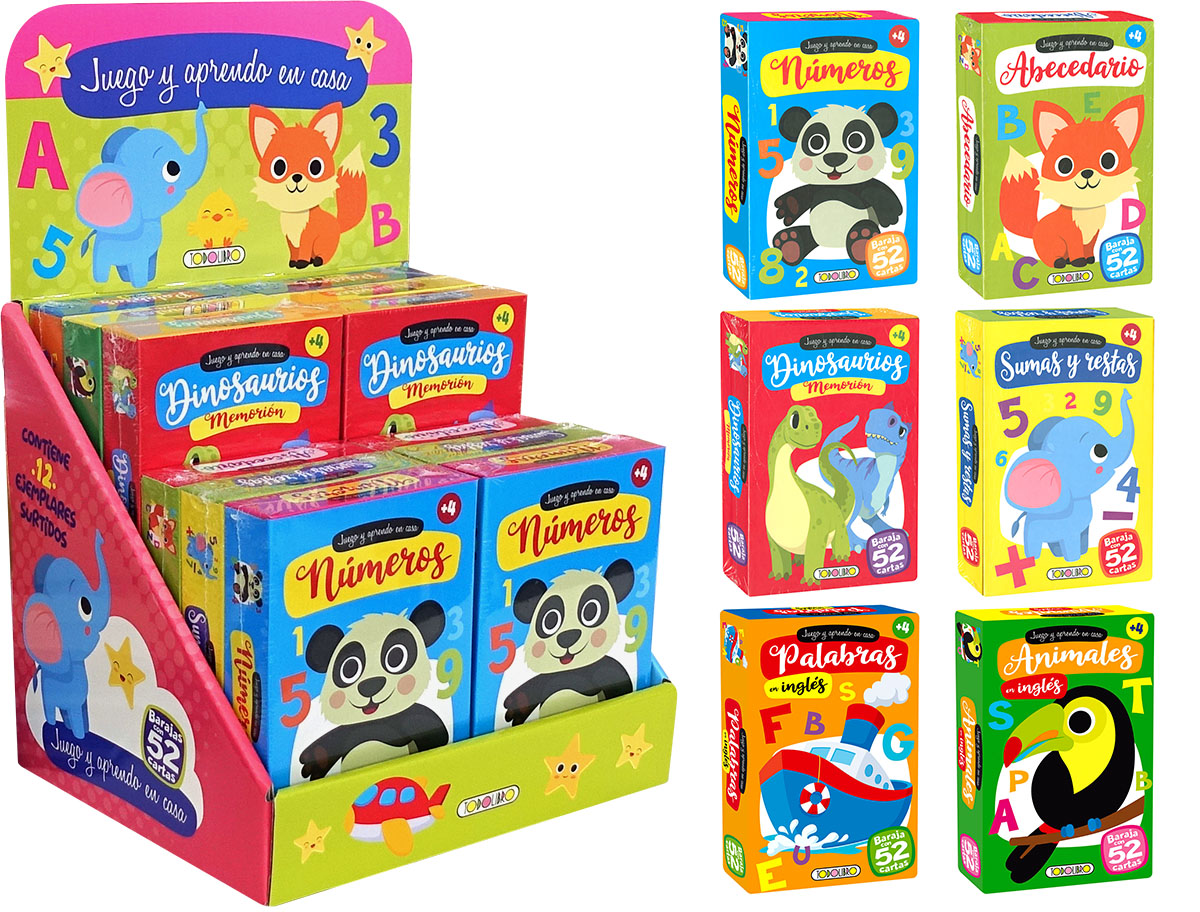 Estuche que contiene 12 ejemplares surtidos. Barajas con 52 cartas cada una e ilustraciones a todo color para que los m?s peque?os se diviertan con los n?meros, las letras y los dinosaurios.