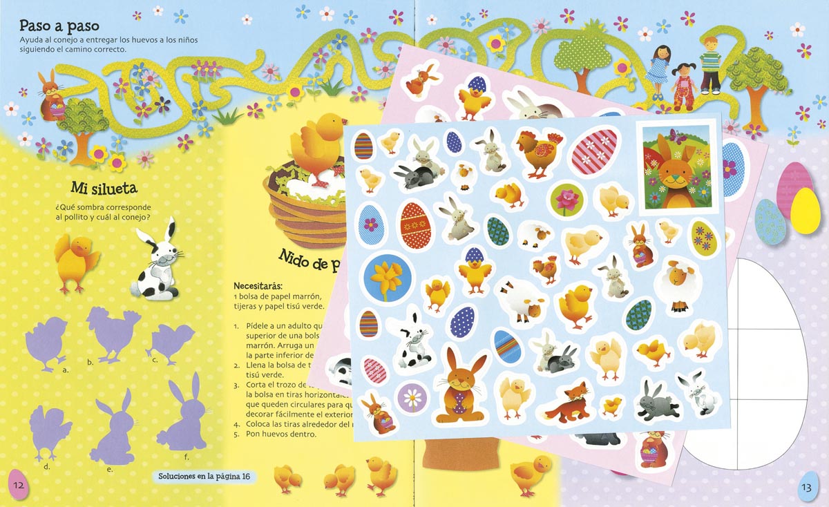 Encuadernación:  Carpeta de cartulina, incluye:libro de cartulina plaastificada, pegatinas y unas orejas de conejo