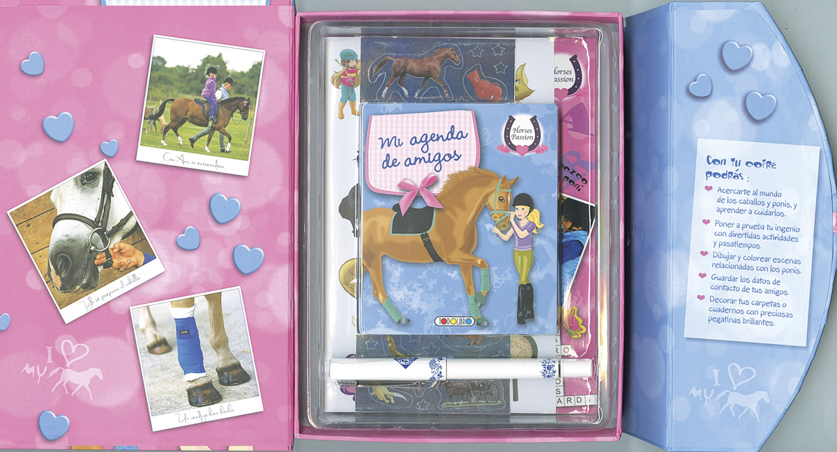 Un fantástico cofre para aprender y disfrutar un montón con los caballos y los ponis. En él encontrarás un bloc con información sobre el mundo de los caballos, además de juegos y actividades; también, incluye una agenda para guardar los datos más importantes de tus amigos, pegatinas, e incluso un bolígrafo.