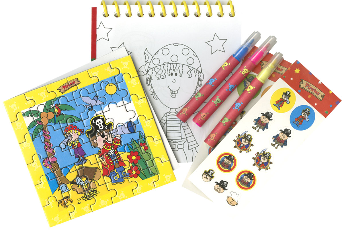 Este libro para colorear se ambienta en el mundo pirata. Se acompaña de rotuladores, pegatinas y un puzle.